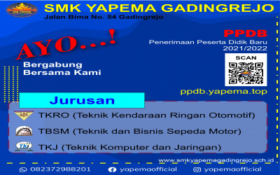 SMK YAPEMA GADINGREJO TELAH MEMBUKA PENDAFTARAN PESERTA DIDIK BARU TAHUN PELAJARAN 2024/2025. SMK YAPEMA memiliki 3 program keahlian : Teknik dan Bisnis